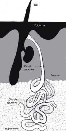 La topographie de la localisation de la maladie limitée aux zones avec des glandes apocrines a donné lieu à plusieurs hypothèses concernant le rôle de ces glandes dans l’apparition de la maladie. Certains ont suggéré une obstruction du canal à travers lequel ces glandes se terminent dans le follicule pileux (Figure 1). Cette hypothèse, malheureusement, est erronée, la seule maladie dans laquelle une telle obstruction existe (maladie de Fox-Fordyce) a des symptômes très différents. D’autres évoquent une obstruction située en amont, au niveau du follicule pileux lui-même.